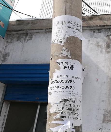 健康街南巷瘦吧減肥附近電線桿出租房小廣告(吳瓊 攝)