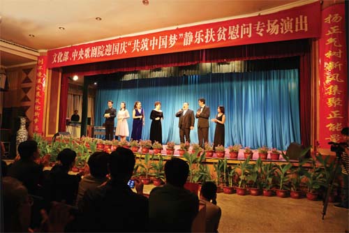 日前,文化部、中央歌劇院在靜樂縣舉辦了迎國慶“共筑中國夢”扶貧慰問專場演出。中央歌劇院的藝術(shù)家與當(dāng)?shù)馗刹咳罕娡_獻(xiàn)藝,共同重溫紅色經(jīng)典,熱情謳歌黨的光輝業(yè)績。整場演出薈萃眾多藝術(shù)名家,演員們激情演唱了《我們走在大路上》《我為祖國獻(xiàn)石油》《打起手鼓唱起歌》《草原上升起不落的太陽》等膾炙人口的經(jīng)典老歌,引起了觀眾強烈的共鳴,現(xiàn)場掌聲、歡呼聲、叫好聲連綿不斷。演出不僅給當(dāng)?shù)厝罕妿硪粓鼍始姵实奈幕⒀纾布盍烁扇糊R心協(xié)力打好脫貧攻堅戰(zhàn)的斗志,增強了百姓實現(xiàn)全面脫貧、全面小康的信心和決心。(小敏 攝)