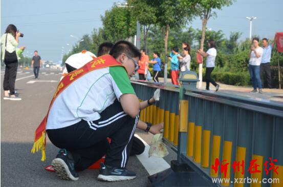 參加活動的學(xué)生,在環(huán)衛(wèi)工人指導(dǎo)下擦試道路中間的隔離欄。