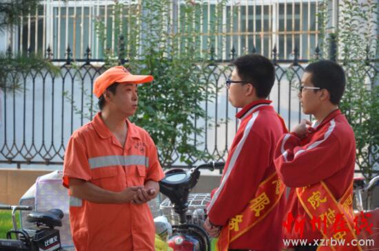 圖為學(xué)生和完成晨掃的環(huán)衛(wèi)工人進(jìn)行交談。