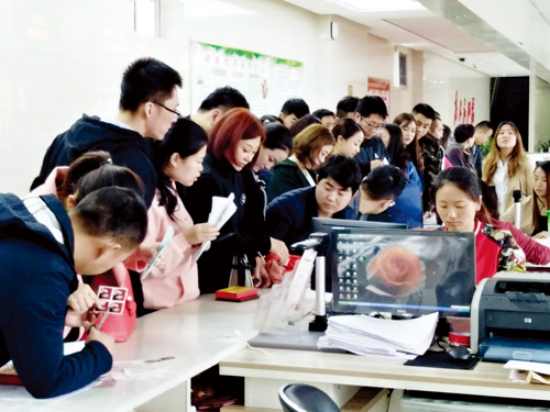 圖為現(xiàn)場扎堆領(lǐng)證的準新人 張林泉 攝影報道
