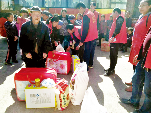 深秋的早晨伴著涼風(fēng),空氣中帶著絲絲冷意,志愿者們乘坐的中巴車緩緩地駛?cè)胩J草溝村。中巴車還沒停穩(wěn),在村口曬太陽的村民就都圍了過來。當(dāng)村民們得知志愿者的來意后,非常感謝志愿者的愛心幫助。此時大家一鼓作氣將車上帶來的慰問品搬了下來,分類后開始分發(fā)。本次活動主要探望的是該村的13戶孤寡老人,慰問物品包括每人一桶油、一袋面、一袋米以及食鹽、醬油、醋等生活必需品。志愿者還為當(dāng)?shù)氐膬和瘻?zhǔn)備了新書包以及防寒過冬的衣服。經(jīng)過一個小時的忙碌,慰問品分發(fā)完畢。