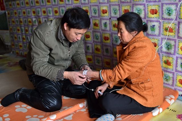 賀星龍(左)在為山西省臨汾市大寧縣徐家垛鄉(xiāng)曹家坡村的一位村民看病。新華社記者曹陽攝