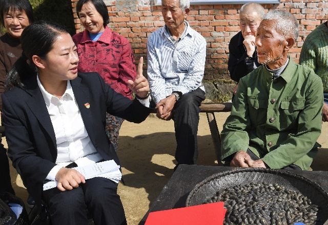 安徽省金寨縣花石鄉(xiāng)大灣村扶貧工作隊副隊長余靜(前左)在金寨縣大灣村與村民交流。新華社發(fā)