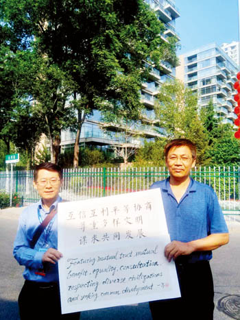 作品由兩件組成,均由宣紙裝裱,尺幅90×60,內(nèi)容體現(xiàn)的是“上海精神”。一件由一爾分作三行,用毛筆大楷書寫,內(nèi)容是“互信互利平等協(xié)商,尊重多樣文明,謀求共同發(fā)展”,另一件為對(duì)應(yīng)的意譯毛筆英語,分四行完成。
