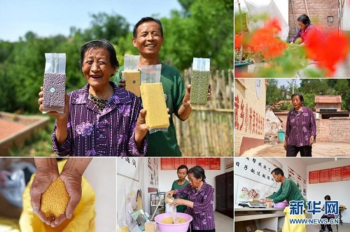 張成華,女,1949年出生,山西省長治市武鄉(xiāng)縣嶺頭村人。近年來,嶺頭村在縣里有關(guān)部門的扶持下,對村民開展電商培訓(xùn)。村民們嘗試著在手機(jī)上“開店”,把小米、核桃、綠豆等農(nóng)產(chǎn)品在網(wǎng)絡(luò)上售賣。張成華的兒子魏寶玉開了網(wǎng)店后,自家的農(nóng)產(chǎn)品在網(wǎng)上銷售良好,家庭收入明顯增加。 左上:張成華(前)和兒子魏寶玉展示自家種的農(nóng)產(chǎn)品;右上:張成華在家中院子里收拾;右中:張成華走在村里的路上;右下:張成華的兒子魏寶玉將準(zhǔn)備發(fā)貨的農(nóng)產(chǎn)品進(jìn)行稱重;下中:張成華(前)將小米裝袋;下左:張成華在查看小米質(zhì)量(拼版照片,6月12日攝)。 地處晉東南的山西省長治市,位于由太行山、太岳山環(huán)繞而成的上黨盆地中。在群山中、崖壁上,許多村莊自然條件惡劣,基礎(chǔ)設(shè)施落后,脫貧致富是大山深處人們的迫切心愿。 近年來,一場場脫貧攻堅(jiān)戰(zhàn),在一個個深山村打響。政府全力探索脫貧路徑的同時(shí),山區(qū)百姓因地制宜,靠自己的雙手和智慧走上致富路,交出了一份扎實(shí)的脫貧答卷。 記者在太行山、太岳山一路尋訪,記錄下多位70歲老人的生活。這些共和國的同齡人,親歷了山鄉(xiāng)的巨變,見證著長治山區(qū)脫貧攻堅(jiān)偉大工程的一步步推進(jìn)。 新華社記者 詹彥 攝