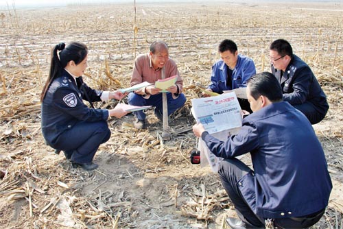 為了將《中華人民共和國大氣污染防治法》和《五臺縣人民政府嚴(yán)防森林火災(zāi)的通告》宣傳到戶、到人,五臺縣環(huán)保局組織工作人員,分組劃片深入到田間地頭,面對面讀報(bào)給農(nóng)民聽,為農(nóng)民解釋燒秸稈、燒荒等野外違規(guī)用火行為的危害。臺城鎮(zhèn)西關(guān)村66歲的農(nóng)民張存在說:“你們這樣解釋,咱懂。我家4畝地的秸稈保證不燒一根。”圖為五臺縣環(huán)保局工作人員在田間地頭宣傳環(huán)境保護(hù)相關(guān)知識。(金俊賢 辛宇 攝影報(bào)道)