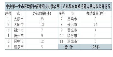 中央第一生態(tài)環(huán)境保護(hù)督察組交辦我省第十八批群眾舉報問題125件,辦結(jié)125件。公示125件,其中太原市38件、大同市13件、朔州市7件、忻州市9件、晉中市12件、陽泉市5件、呂梁市8件、長治市14件、晉城市4件、臨汾市9件、運(yùn)城市6件。可登錄山西省人民政府網(wǎng)站或掃描二維碼查閱群眾信訪舉報轉(zhuǎn)辦和邊督邊改公開情況一覽表。