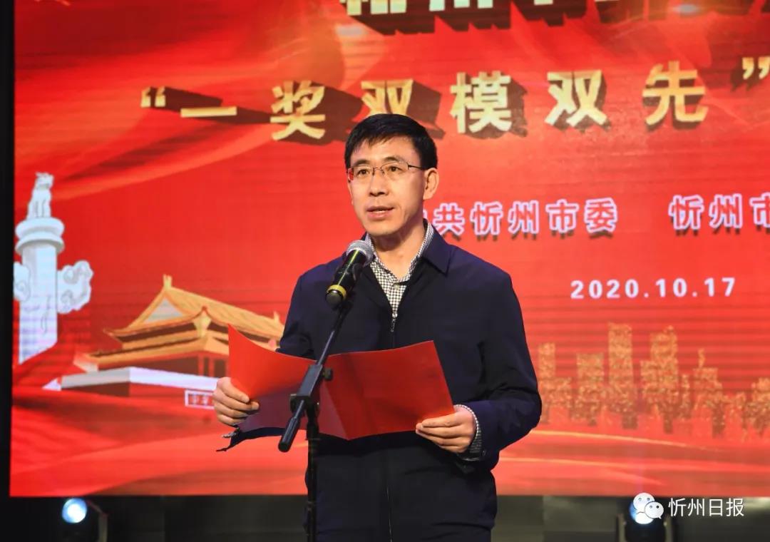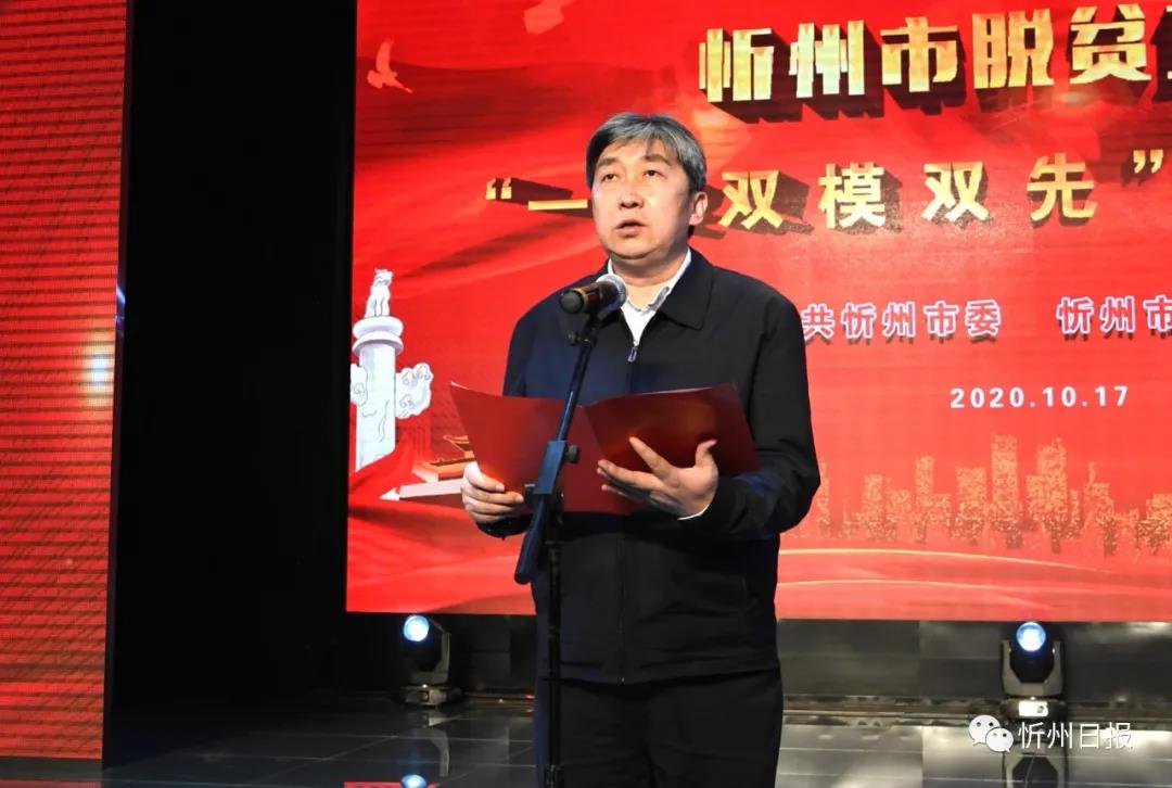 秦書義宣讀《中共忻州市委忻州市人民政府〈關(guān)于表彰2020年忻州市脫貧攻堅(jiān)“一獎(jiǎng)雙模雙先”的決定〉》。劉紀(jì)森