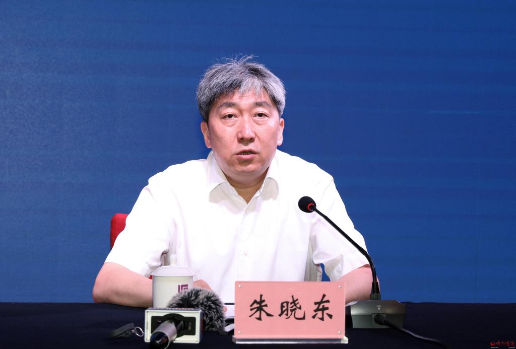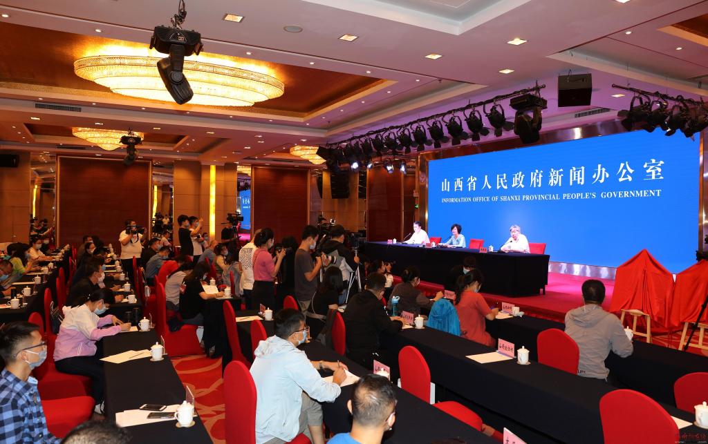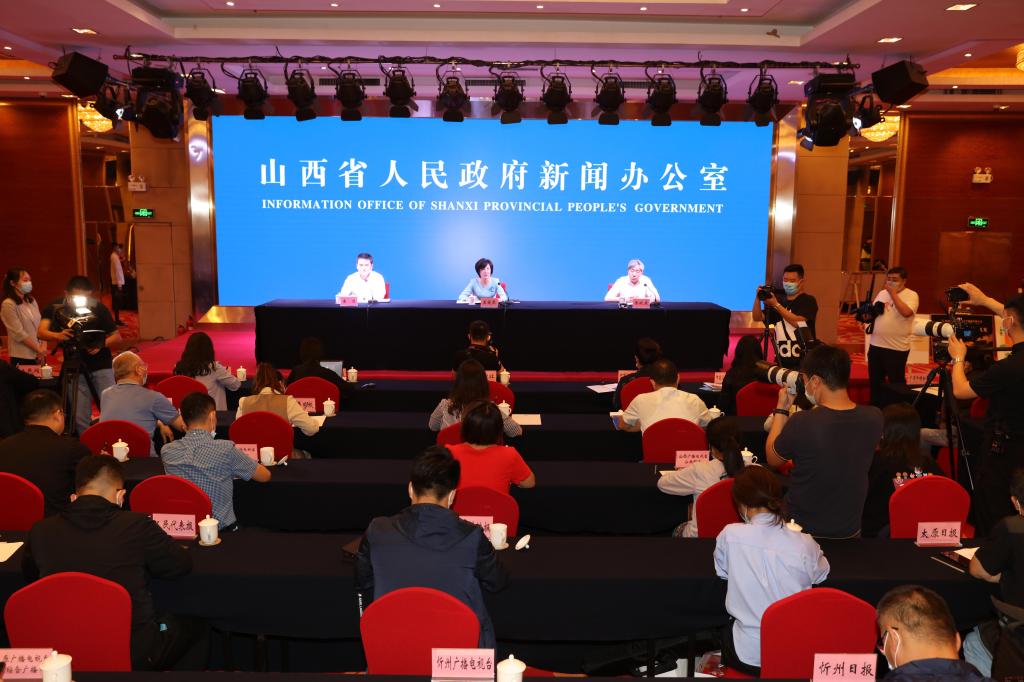 朱曉東介紹忻州市承辦大會相關情況,公布大會標識、海報和亮點活動,并回答記者提問。范濤攝