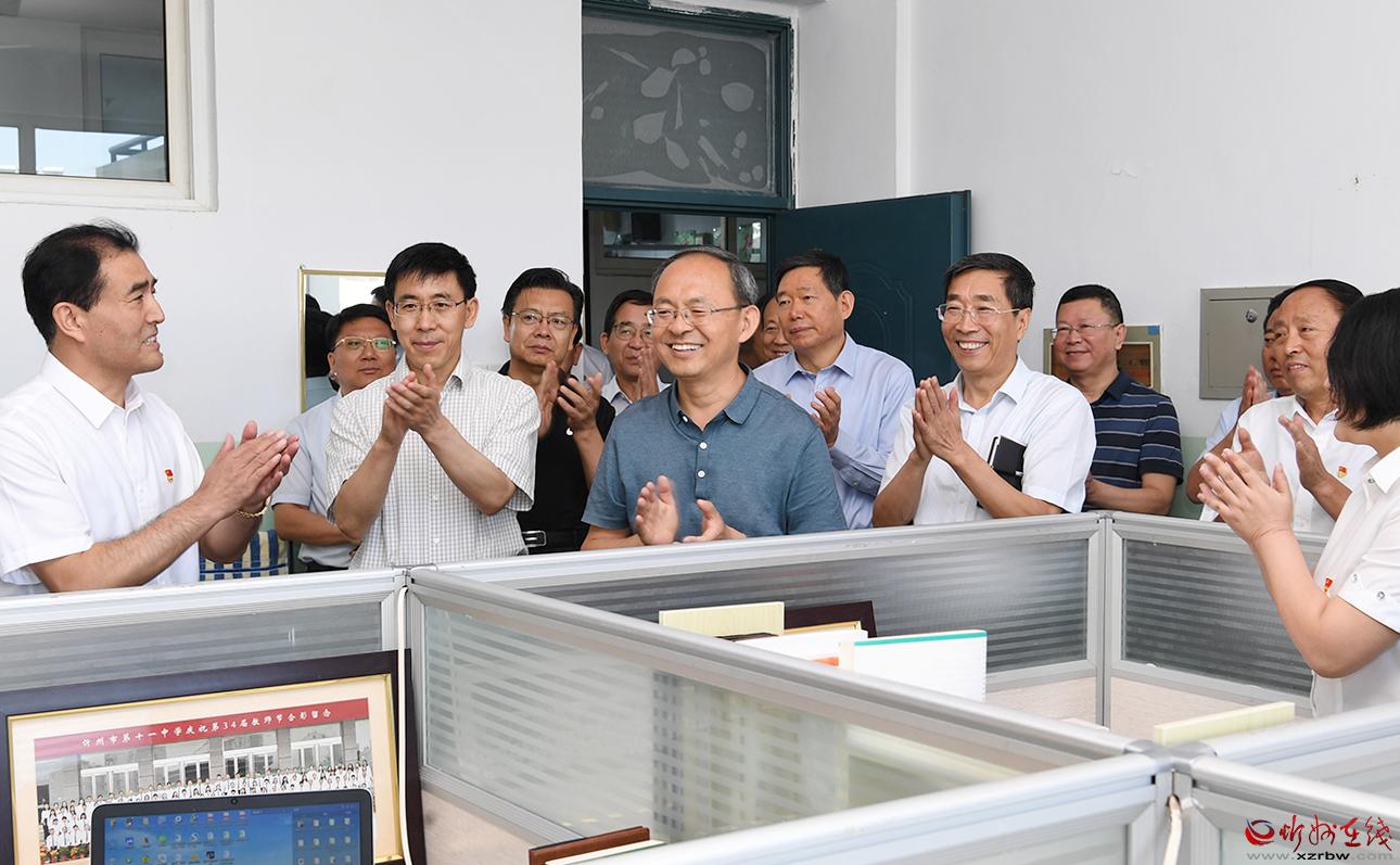 在忻州十一中。劉紀(jì)森 攝 忻州十一中屬于市直公立初中,學(xué)校不斷完善教學(xué)管理制度,營造科學(xué)育人氛圍,推動教學(xué)質(zhì)量穩(wěn)步提升。鄭連生一行到初一年級組看望慰問了正在備課的教師,了解了他們的工作生活情況。鄭連生感謝廣大教師為忻州教育事業(yè)作出的貢獻(xiàn),希望教師們常懷為師的責(zé)任擔(dān)當(dāng),繼續(xù)發(fā)揚(yáng)甘為人梯、無私奉獻(xiàn)的精神,深入鉆研業(yè)務(wù),探索教學(xué)方法,培養(yǎng)出更多優(yōu)秀學(xué)生。鄭連生還就該校操場改建問題進(jìn)行現(xiàn)場辦公。