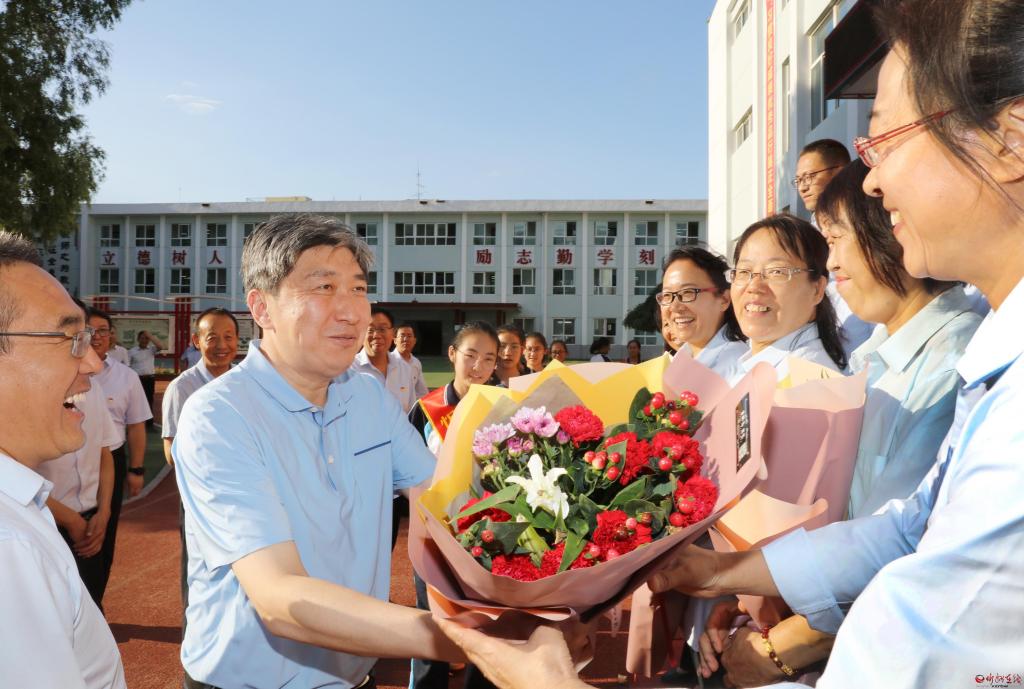 在忻州高級中學(xué)。范濤 攝 每到一處,朱曉東都向教師們致以節(jié)日問候。長征小學(xué)西校區(qū)是一所高標(biāo)準(zhǔn)規(guī)劃、高水平建設(shè)的新建學(xué)校,今年秋季學(xué)期投入使用。朱曉東察看電子圖書閱覽等教學(xué)新設(shè)施,了解學(xué)校開設(shè)的書法、歌唱、手工、足球、乒乓球、跆拳道、機(jī)器人組裝等特色教育課程,隨機(jī)檢查學(xué)生飲用水機(jī)具,向從基層選拔聘用的優(yōu)秀教師代表贈送書籍,勉勵大家珍惜崗位,肩負(fù)起時代賦予的重任,全心全意培養(yǎng)好人才。具有40多年歷史的忻州六中辦學(xué)底蘊(yùn)厚重,近年來與時俱進(jìn)提升教學(xué)能力。朱曉東實(shí)地了解學(xué)校發(fā)展情況后,一一為教師代表獻(xiàn)上鮮花,感謝大家辛勤付出,希望學(xué)校越辦越好,讓孩子們在學(xué)校有更多收獲。忻州高級中學(xué)教學(xué)設(shè)施先進(jìn),教師隊(duì)伍素質(zhì)高、經(jīng)驗(yàn)豐富,今年學(xué)校畢業(yè)班高考再次取得好成績。朱曉東詳細(xì)了解學(xué)校歷史和往屆學(xué)生成就,鼓勵教師們放長眼光,對照更高標(biāo)準(zhǔn)繼續(xù)努力,為忻州增光添彩。 朱曉東在慰問時強(qiáng)調(diào),教師崗位光榮、使命重大,是決定學(xué)校辦學(xué)質(zhì)量的關(guān)鍵。忻州教育事業(yè)一年一個新臺階、一年一個新變化,與廣大教師的努力付出、辛勤工作息息相關(guān)。教師的工作是為地方、為社會、為國家打基礎(chǔ)、立長遠(yuǎn)的戰(zhàn)略性工作,各級各部門要堅(jiān)決貫徹落實(shí)黨的教育方針,尊重教師、呵護(hù)教師、全力保障教師。教師要全面落實(shí)立德樹人根本任務(wù),尊重教育規(guī)律和人才成長規(guī)律,把社會主義核心價值觀融入教育全過程,促進(jìn)孩子們健康快樂地成長。要讓孩子們包括文化知識在內(nèi)全面發(fā)展,像澆灌苗木一樣不斷培養(yǎng)塑造學(xué)生的心靈,讓孩子們有愛心,愛家人、愛社會、愛祖國,讓孩子們在知識儲備、心理健康、寬廣胸懷、廣闊視野上打好基礎(chǔ),讓忻州的學(xué)子在步入社會后,個個綜合素質(zhì)優(yōu)越,潛力長遠(yuǎn)、底蘊(yùn)深厚,成為一個個為社會作貢獻(xiàn)的人才。希望廣大教師根據(jù)自身實(shí)踐,結(jié)合忻州實(shí)際,在教學(xué)、教育方面提出好的意見和建議,大家凝聚智慧,共同努力把忻州的教育質(zhì)量、教育事業(yè)辦得更加讓人民滿意,更加出彩。 (責(zé)任編輯:盧相?。?/span> |