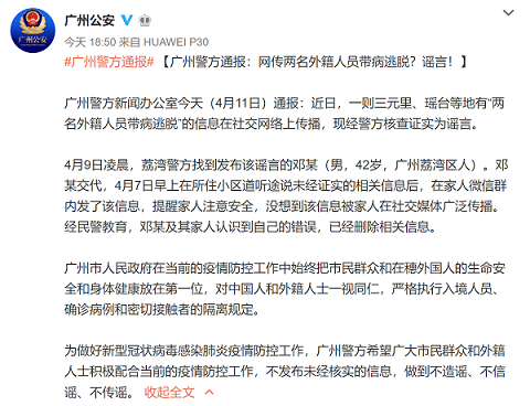 為做好新型冠狀病毒感染的肺炎疫情防控工作,廣州警方希望廣大市民群眾和外籍人士積極配合當(dāng)前的疫情防控工作,不發(fā)布未經(jīng)核實的信息,做到不造謠、不信謠、不傳謠。