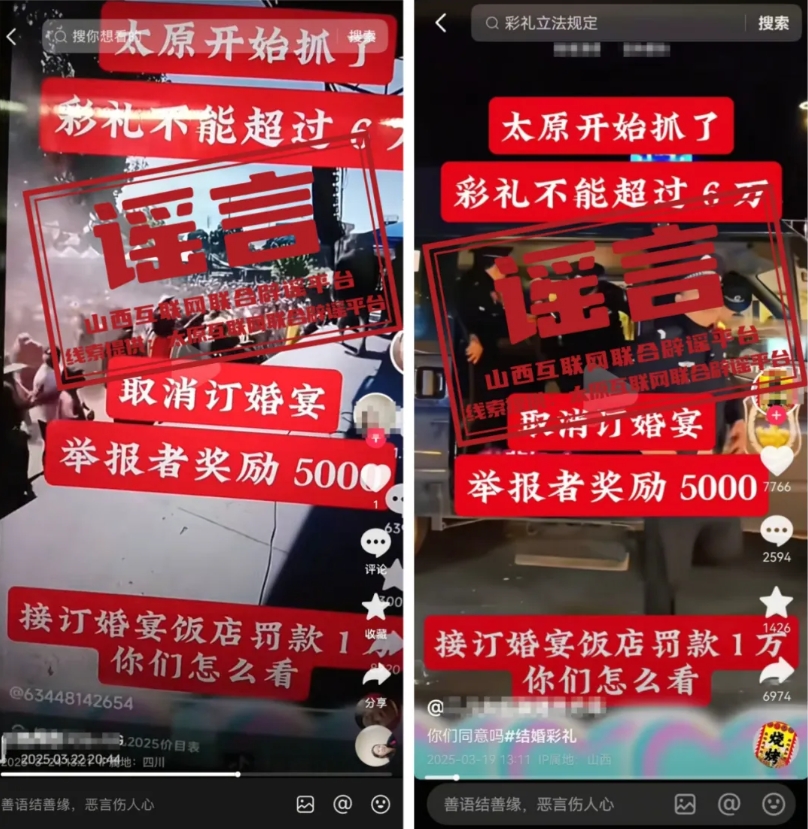 近日,網(wǎng)絡(luò)上流傳“太原彩禮限6萬(wàn),違規(guī)者將被罰款甚至拘留”的消息,引發(fā)關(guān)注。經(jīng)屬地相關(guān)部門(mén)調(diào)查核實(shí),以上為不實(shí)信息,并無(wú)任何官方文件或政策依據(jù)。太原互聯(lián)網(wǎng)聯(lián)合辟謠平臺(tái)已發(fā)布相關(guān)辟謠信息,望廣大網(wǎng)民不聽(tīng)、不信、不傳。