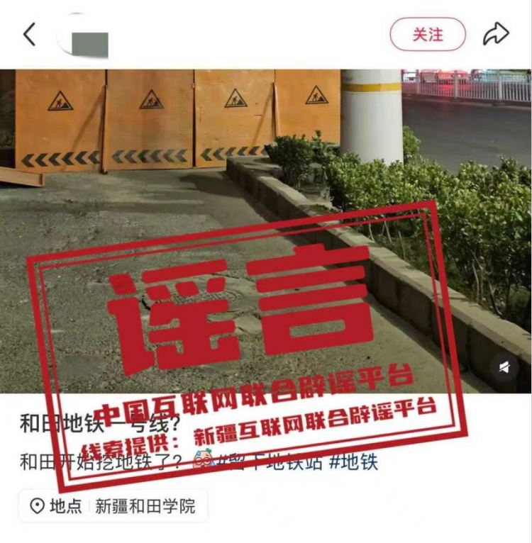 真相:近日,有網(wǎng)民發(fā)布消息稱“新疆和田要建地鐵一號(hào)線?開(kāi)始挖地鐵了?”,并配以道路施工圖片,引發(fā)關(guān)注。經(jīng)和田市交通運(yùn)輸局核實(shí),網(wǎng)傳信息系謠言,截至目前,未收到任何關(guān)于和田市開(kāi)挖地鐵的工作通知或確認(rèn)信息。(來(lái)源:“新疆網(wǎng)絡(luò)辟謠”微信公眾號(hào))