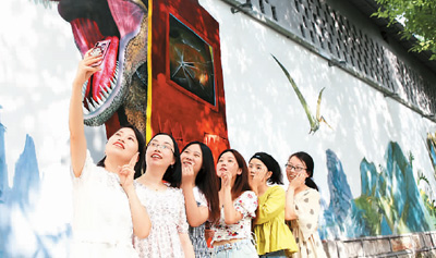 人們在“網(wǎng)紅打卡點”重慶永川恐龍3D藝術(shù)墻繪前留影。陳仕川攝 (人民圖片)