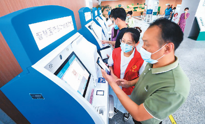 居民在浙江省湖州市吳興區(qū)人民醫(yī)院使用智慧醫(yī)療多功能自助機(jī)支付醫(yī)藥費(fèi)。新華社記者 徐 昱攝