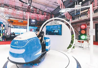 參觀者在2021世界5G大會展覽現(xiàn)場體驗(yàn)5G+車聯(lián)網(wǎng)VR虛擬駕駛。新華社記者 任超 攝