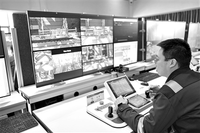 在天津港全物聯(lián)網(wǎng)集裝箱碼頭智控中心,工作人員遠程操控碼頭機械設(shè)備。 新華社記者 張鋮 攝