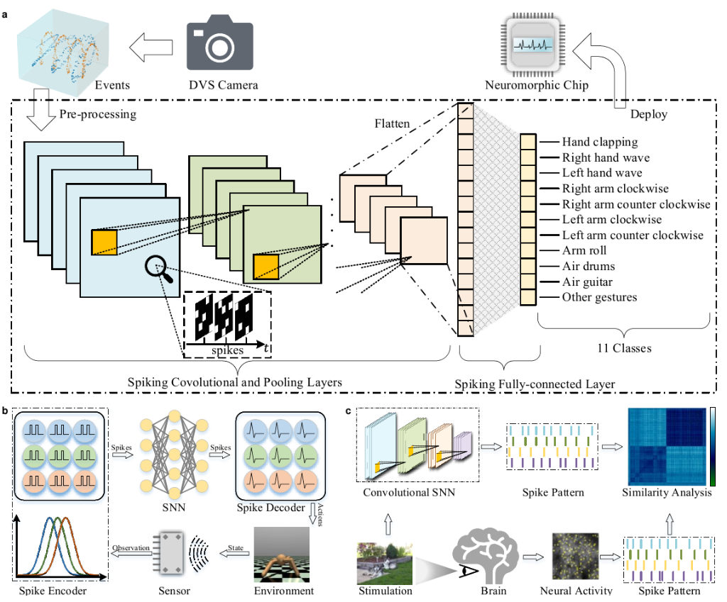 李國(guó)齊介紹,傳統(tǒng)脈沖神經(jīng)網(wǎng)絡(luò)框架更多地關(guān)注生物可解釋性,并不支持自動(dòng)微分,無(wú)法充分利用GPU的大規(guī)模并行計(jì)算能力,也缺乏對(duì)神經(jīng)形態(tài)傳感器和計(jì)算芯片的支持。“驚蟄”框架很大程度上解決了上述問(wèn)題,支持神經(jīng)形態(tài)數(shù)據(jù)處理、深度脈沖神經(jīng)網(wǎng)絡(luò)構(gòu)建和神經(jīng)形態(tài)芯片部署等多項(xiàng)功能。