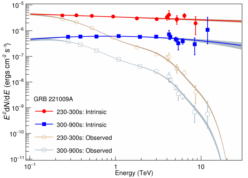 “拉索”測(cè)量的GRB 221009A在230-300秒和300-900秒兩段時(shí)間的伽馬射線能譜。(中國(guó)科學(xué)院高能物理研究所供圖)