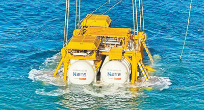 在海南省陵水黎族自治縣英州鎮(zhèn)清水灣的海面上,一艘起重船巨臂高擎,緩緩下落。船上,工作人員緊盯著潛水控制臺(tái)的屏幕,手中精準(zhǔn)操作,重達(dá)1300噸的“海底數(shù)據(jù)艙”穩(wěn)穩(wěn)沉入35米深的海底。