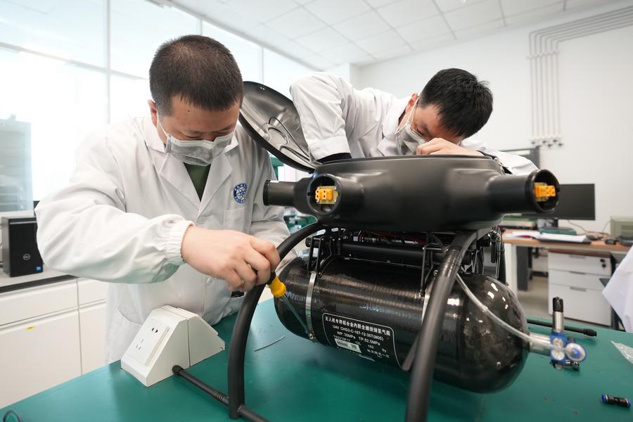 3月28日,科研人員在為無人機(jī)裝配高比能氫混動(dòng)力電源。新華社記者 潘昱龍 攝