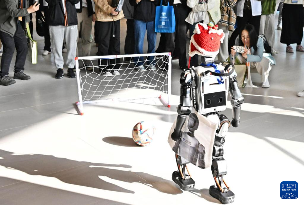 在大會展覽區(qū),一款正在踢足球的具身智能機器人受到不少參觀者圍觀。當工作人員傳球后,機器人馬上跑到足球前將球準確射入球門中,射中后還不忘揮舞手臂以示慶祝。