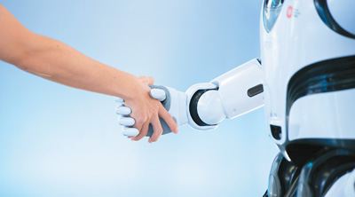 在深圳市優(yōu)必選科技股份有限公司總部,工作人員與熊貓機(jī)器人“優(yōu)悠”握手。新華社記者 毛思倩攝