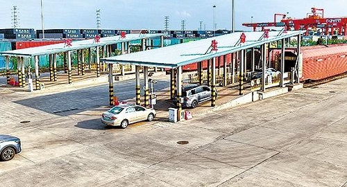 廣州國際物流港基地,工作人員駕駛待運車輛進(jìn)入車廂。張國卿攝