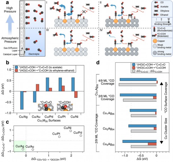 圖為該論文的理論計(jì)算,表明銅-銀稀釋合金催化劑表面更利于單齒型吸附的*C=C=O二碳基團(tuán)的生成,及其需要更高的CO表面覆蓋度以保證碳-碳偶聯(lián)的高效發(fā)生。 新型催化劑破解難題 上述成果論文作者之一、武漢理工大學(xué)材料科學(xué)與工程學(xué)院教授麥立強(qiáng)介紹,他所在團(tuán)隊(duì)聯(lián)合龐元杰教授團(tuán)隊(duì)、多倫多大學(xué)研究團(tuán)隊(duì)的最新研究“限制二碳吸附基團(tuán)構(gòu)象完成一氧化碳向乙酸鹽電還原”,利用低品階的可再生電能,通過二氧化碳催化電解手段,將二氧化碳轉(zhuǎn)化為高附加值的碳基燃料或化學(xué)品。 這項(xiàng)成果對可再生能源的轉(zhuǎn)換與存儲(chǔ)及緩解氣候變化至關(guān)重要,其戰(zhàn)略意義十分重要。 在本項(xiàng)研究工作中,我科研團(tuán)隊(duì)報(bào)道了一種新型稀釋合金催化劑,可在高壓強(qiáng)反應(yīng)條件下,利用電能將一氧化碳高效還原為乙酸。其反應(yīng)最高選擇性(法拉第效率)達(dá)91%,已和二氧化碳至一氧化碳的電還原選擇性相仿,實(shí)現(xiàn)了可再生能源的轉(zhuǎn)換與存儲(chǔ)。 銅基催化劑是在二氧化碳電催化還原反應(yīng)中效率最高的催化劑之一。銅基催化劑雖能高效催化碳-碳偶聯(lián)步驟,但每種多碳產(chǎn)物的選擇性都不高。 為此,該研究工作設(shè)計(jì)了銅-銀稀釋合金催化劑,使銅以原子級(jí)分散在銀基底中,其中銅位點(diǎn)只有2到4個(gè)原子。這迫使碳基團(tuán)進(jìn)入“單齒型”吸附狀態(tài),將反應(yīng)高效導(dǎo)入乙酸生成路徑。 然而,小的銅位點(diǎn)可能無法高效完成碳-碳偶聯(lián)步驟,需更高的反應(yīng)物分子覆蓋度。因此,該研究設(shè)計(jì)了高壓強(qiáng)三相界面反應(yīng)裝置,可在高氣壓條件下保持氣-液兩相平衡,從而穩(wěn)定地反應(yīng),解決催化劑表面反應(yīng)物分子覆蓋度需求。 該研究使用了武漢理工大學(xué)的先進(jìn)原位拉曼光譜技術(shù)證明CO還原過程中的一個(gè)關(guān)鍵中間體,即C=C=O或(OH)C=COH構(gòu)型,為后續(xù)設(shè)計(jì)更高效的催化劑提供理論基礎(chǔ)。經(jīng)濟(jì)技術(shù)可行性分析表明,該技術(shù)在未來應(yīng)用前景廣闊。 據(jù)介紹,這項(xiàng)研究證實(shí)了二氧化碳電還原技術(shù)在分布式清潔能源存儲(chǔ)方面的應(yīng)用潛力,及使用二氧化碳電催化轉(zhuǎn)化技術(shù)進(jìn)行碳基化學(xué)品綠色合成的可行性。 多項(xiàng)指標(biāo)打破世界紀(jì)錄 乙酸作為一種重要的有機(jī)化工原料,制造化纖衣物、香水香氛、塑料加工品等都需大量使用。 “傳統(tǒng)方法生產(chǎn)乙酸通常是采用化學(xué)合成或淀粉發(fā)酵法,用這些方法,每生產(chǎn)1千克醋酸會(huì)排放約1.6千克二氧化碳。”上述成果論文作者之一、華中科技大學(xué)光電信息學(xué)院教授龐元杰表示,我國作為世界第一大乙酸生產(chǎn)國,年產(chǎn)量超800萬噸,給生態(tài)環(huán)境帶來巨大壓力。 龐元杰說,他所在團(tuán)隊(duì)致力于“零碳”制造,不僅讓生產(chǎn)乙酸的過程不產(chǎn)生二氧化碳,還能消耗二氧化碳制備乙酸,為實(shí)現(xiàn)“雙碳”目標(biāo)貢獻(xiàn)一份科技力量。 上述研究成果顯示,該實(shí)驗(yàn)使用二氧化碳和水為原料,生成乙酸這一主要產(chǎn)物,并能連續(xù)820小時(shí)保持乙酸生成率80%以上,在選擇性、能量轉(zhuǎn)化效率、穩(wěn)定性上打破了現(xiàn)有世界紀(jì)錄。 電催化二氧化碳還原技術(shù)是一種極具潛力的清潔能源存儲(chǔ)手段。但在電解過程中,如何高選擇性、高速地生產(chǎn)單一高附加值產(chǎn)物卻是研究團(tuán)隊(duì)困擾已久的問題。 電解水只可獲得氧氣和氫氣,電解二氧化碳卻可獲得20余種產(chǎn)物。 “為穩(wěn)定乙酸的生成率,首先要解決的是反應(yīng)裝置設(shè)計(jì)與搭建,其次是催化劑的選擇?!饼嬙苷f,利用高壓裝置和催化劑上的創(chuàng)新,團(tuán)隊(duì)以電催化二氧化碳還原技術(shù)為基礎(chǔ),采用“兩步法”二氧化碳還原途徑,穩(wěn)定住乙酸反應(yīng)路徑的關(guān)鍵中間基團(tuán),最終高產(chǎn)率合成了乙酸。 利用該技術(shù),不僅是乙酸這類羧酸類化學(xué)品,烴類、醇類等重要化學(xué)品也有望實(shí)現(xiàn)“零碳”制造,讓二氧化碳在醫(yī)藥、燃料、化工原料的生產(chǎn)過程中得到更廣泛應(yīng)用。 據(jù)悉,該技術(shù)還可將太陽能發(fā)電板的電能轉(zhuǎn)換為便于儲(chǔ)存的燃料化學(xué)能,再將燃料化學(xué)能有序釋放,實(shí)時(shí)滿足生活和生產(chǎn)的各種用能需求。(陳剛 劉雪茹 范千 吳純新) (責(zé)任編輯:蔡文斌) |