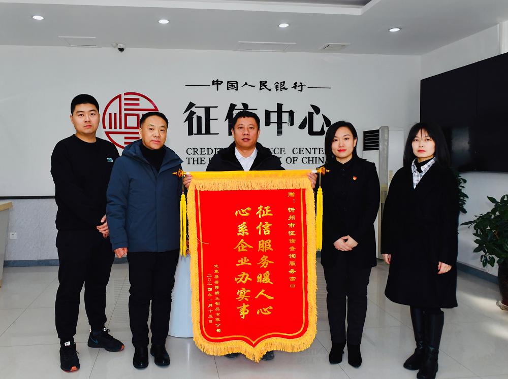 1月15日上午,定襄縣晉博鍛壓制品有限公司負(fù)責(zé)人將一面寫有“征信服務(wù)暖人心,心系企業(yè)辦實(shí)事”的錦旗送到了人民銀行忻州市分行征信查詢服務(wù)窗口,感謝為其高效處理征信異議,幫助企業(yè)解決資金往來(lái)受阻困境。