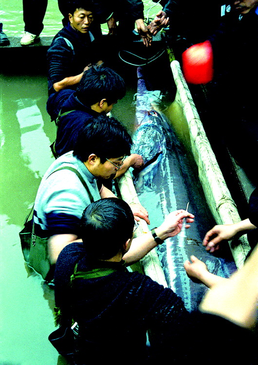 ▲2003年1月27日,在四川宜賓主城區(qū)附近的長(zhǎng)江岸邊,專(zhuān)家正在對(duì)一只白鱘進(jìn)行救治,這只白鱘是一位漁民在涪溪口發(fā)現(xiàn)的。