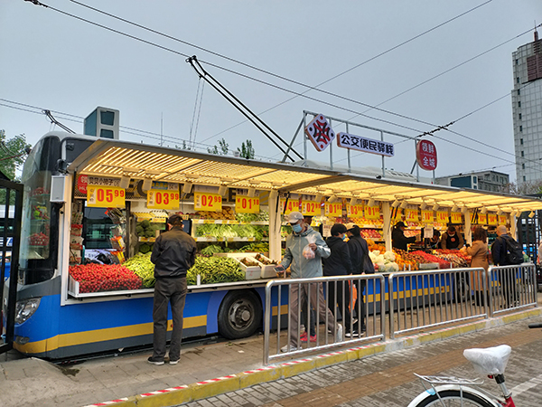 早上8點,走出柳芳地鐵站,記者就看到一輛充滿公交車元素的“小型菜場”,前來買菜的人絡繹不絕?!耙郧敖?jīng)常網(wǎng)購水果,送過來都不太新鮮了,現(xiàn)在出門就能買,新鮮還實惠?!闭谔暨x水果的蔡阿姨說。
