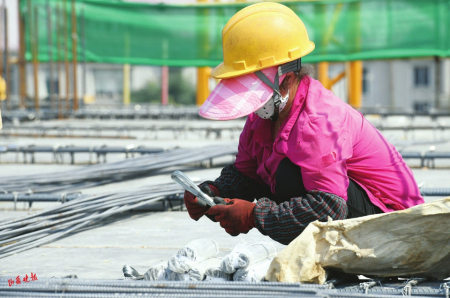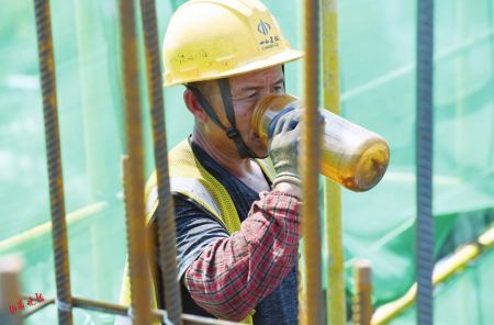 當(dāng)日,是入伏第一天,意味著開始進(jìn)入一年中最熱的時(shí)候。在熱火朝天的施工現(xiàn)場(chǎng),工人師傅們埋頭苦干,他們雖然戴著自制遮陽帽、冰袖,身旁放著水壺,但一小會(huì)兒工夫就會(huì)汗流浹背?!斑@樣的杯子,我每天要喝好幾杯水?!碧鞖馓珶?,來自四川樂山的林英把杯子里的水一飲而盡。黝黑的皮膚、如雨的汗水、潮濕的后背……當(dāng)大多數(shù)人避暑納涼時(shí),不少勞動(dòng)者卻辛勤地?fù)]灑著汗水,堅(jiān)守在施工一線。在這個(gè)工地上,有很多和林英一樣的打工人,他們來自全國各地,用青春和汗水建設(shè)美麗山西。