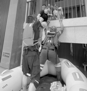 8月1日19時30分許,隊員們剛抵達(dá)涿州,就迅速進(jìn)入能見度只有1米的水域搜救被困者?!按蹇谝话敫叩拈T樓被淹沒,由于天色較晚,加上水面上有濃霧,我們駕駛著兩艘橡皮艇相互配合低速前往尋找被困群眾。”山西新青年應(yīng)急救援隊常務(wù)副總指揮姚文俊說,因為有豐富的水域救援經(jīng)驗,他們根據(jù)樹木和道路指示牌判定前行方向,將3名被困者轉(zhuǎn)移到安全地帶。