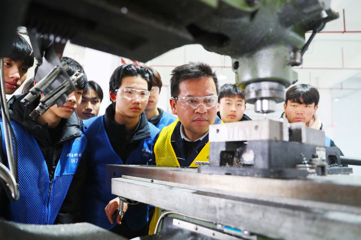 2024年1月9日,在湖南省永州市新田縣產(chǎn)業(yè)開發(fā)區(qū)永州群翰科技有限公司車間,新田縣職業(yè)中等專業(yè)學(xué)校學(xué)生在工廠師傅的指導(dǎo)下學(xué)習(xí)機(jī)床操作技術(shù)。近年來(lái),該校聯(lián)合企業(yè)開展“產(chǎn)教融合、校企辦學(xué)”模式,助推就業(yè)創(chuàng)業(yè)。新華社發(fā)(劉貴雄 攝)