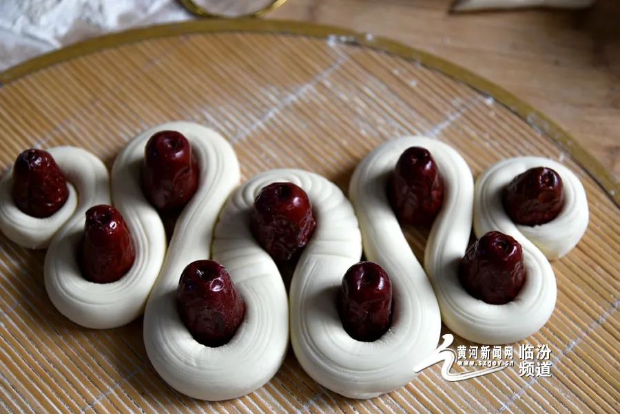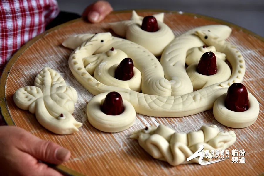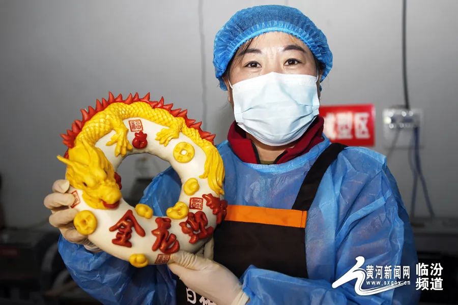 在晉南,蒸花饃是不可缺少的一項年俗?;x藝人用面粉、果蔬汁、雞蛋和牛奶等食材為原料,巧手捏制出“金龍迎春”“迎春納?!钡仍⒁饧榈南盗谢x,為即將到來的龍年春節(jié)增添了濃濃的年味。