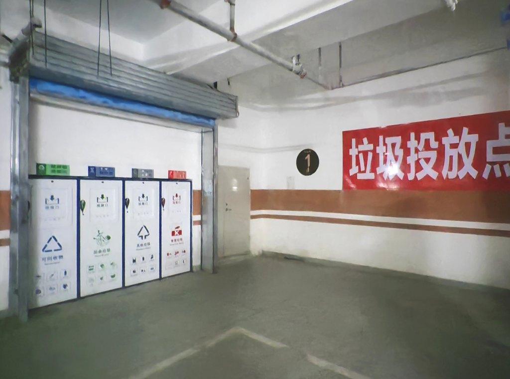 樹(shù)華園小區(qū)里沒(méi)有地面垃圾桶,只在一些日常人流密集區(qū)域設(shè)置有果皮箱和垃圾回收機(jī)。小區(qū)共有36棟住宅樓,按照每三到五棟樓為一個(gè)組團(tuán),在地下停車(chē)場(chǎng)集中設(shè)置了垃圾分類(lèi)投放點(diǎn)。