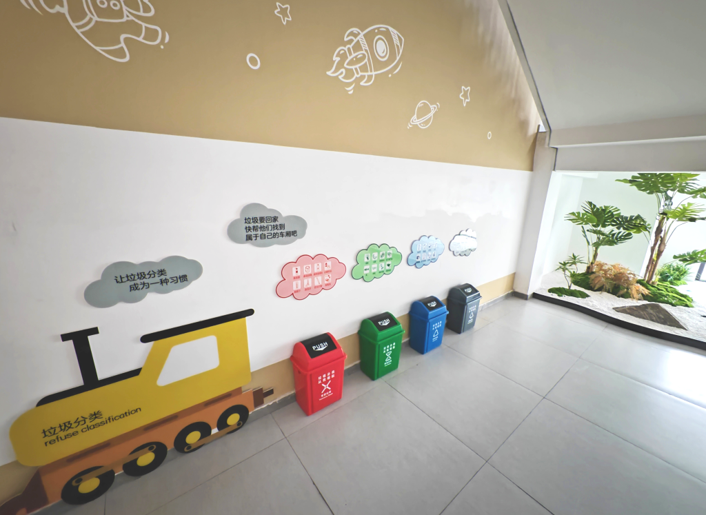 3月28日,悅?cè)菪W(xué)教學(xué)樓內(nèi)的垃圾分類(lèi)箱。新華社記者楊帆攝