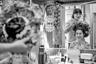 在福建省泉州市中山路的一家蟳埔女簪花圍體驗店,老板為游客簪花。新華社發(fā)