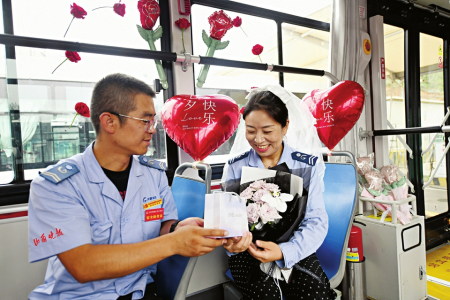 另一對公交夫妻是今年同為39歲的焦更新和李靈,均是812路公交車駕駛員,他們倆是初中同學(xué),當(dāng)天還是他們結(jié)婚第17年的紀(jì)念日。一大早,焦更新就來到車隊(duì),布置車廂,等著妻子的到來。“老婆,結(jié)婚紀(jì)念日快樂!也祝你七夕快樂!”李靈看著鮮花和禮物很是驚訝,走到布置好的車廂后,更是紅了臉?!罢鏇]想到今年的結(jié)婚紀(jì)念日能收到這么大的驚喜,鮮花、浪漫的車廂,還有化妝品,很開心很感動(dòng),感謝老公的這份愛意。在工作中,我會(huì)把這份愛意傳遞給更多的乘客?!庇兄?2年駕齡的李靈,是一名五星級(jí)駕駛員,她在提升駕駛技術(shù)和服務(wù)等方面很是鉆研,工作中還有自己的很多創(chuàng)新,在車廂布置“便民袋”,放上地圖、問候乘客的手繪海報(bào)等,細(xì)微的服務(wù)打動(dòng)了很多乘客,她把車廂當(dāng)成自己的家一樣呵護(hù)。