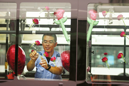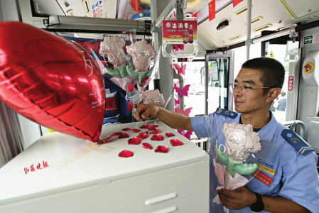 七夕節(jié)即將到來,8月8日,在太原公交第三汽車分公司,公交車廂里上演了一場別樣的浪漫——堅(jiān)守在一線的兩名公交司機(jī)閻樹德和焦更新,分別為出車回來的妻子準(zhǔn)備了大大的驚喜。用送花、提前準(zhǔn)備飯菜、布置車廂等行動(dòng)表達(dá)自己的愛意。