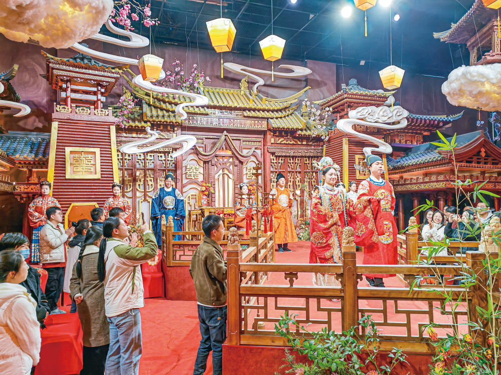 現(xiàn)在村里不僅可以提供周、漢、唐、宋、明等不同禮制的中式傳統(tǒng)婚禮服務,景區(qū)日常還上演著迎賓禮、出閣禮、正婚禮等表演,讓客戶下單前就可以提前審視自己婚禮的效果。部分古民居經(jīng)過修繕裝修開設的民宿,還分成了“男方院”“女方院”,方便全套迎親流程在這里展開。
