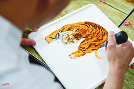 1.在阿峰的操作下,一只栩栩如生的老虎“躍然”盤上。