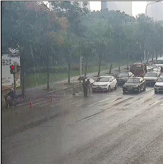 當(dāng)老人好不容易快走到馬路對(duì)面時(shí),天公不作美,突然下起瓢潑大雨,又一幕感人的瞬間出現(xiàn)了:一輛等候通行的小轎車(chē)上下來(lái)一名女司機(jī),從后備廂拿出一把雨傘后,快步跑上前,遞到老人手里。