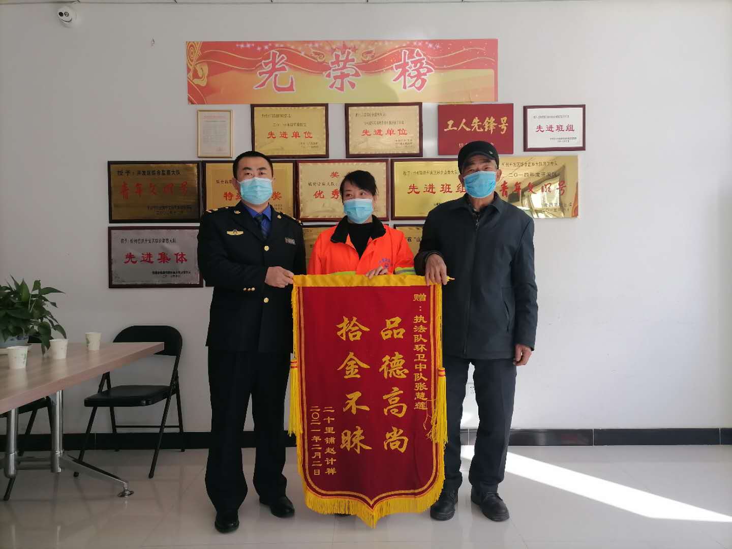 “真是遇到了好心人,我們一家人這下可以安心過個年了!……”當泛華小區(qū)門衛(wèi)趙大爺親手接過失而復得的巨額現(xiàn)金時,抑制不住內(nèi)心的激動,緊緊握著環(huán)衛(wèi)女工張慧蓮的手不停地道謝,并送上全家人的心愿“拾金不昧 品德高尚”錦旗。
