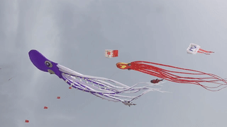 其他海洋生物也不甘示弱, 誓要在天空留下自己的名字。 一條條金魚瞪著大大的眼睛, 準備靠自己的嬌羞與可愛“艷壓群箏”。