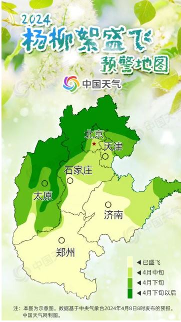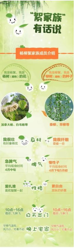 以華北地區(qū)最早開始飄絮的白毛楊為例,當日平均氣溫大于0℃時,白毛楊才能正常生長發(fā)育,將這些超過0℃的數值累加起來,當總和達到480℃,且日平均氣溫達到14℃,楊絮就開始飄飛。華北一帶,往往4月上旬前后達到這一標準。楊絮飄飛10余天后,柳絮也會進入飄飛期。