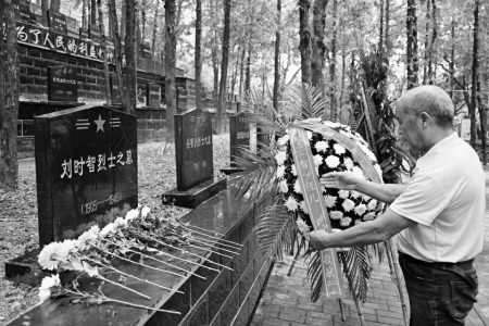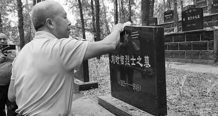 長子獨立團團長劉時智烈士的墓碑前,來自湖北省紅安縣華河鎮(zhèn)大學(xué)村的劉正業(yè)捧著從家鄉(xiāng)帶來的水和土,淚流滿面,反復(fù)說著“侄子不孝,現(xiàn)在才找到您,這么晚才來看您。”